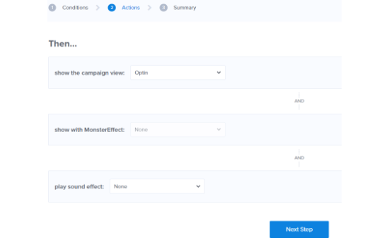 Em seguida, clique no botão ‘Próxima etapa’ para alterar as configurações de ação. Você pode deixar as configurações de ‘mostrar a visualização da campanha’ para Optin e selecionar se deseja reproduzir um efeito sonoro quando a barra de alerta aparecer.